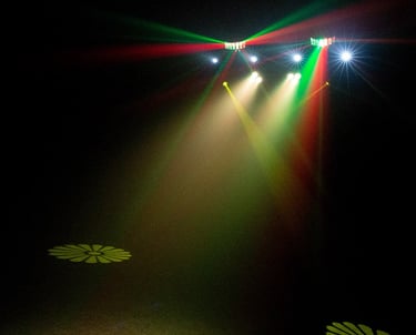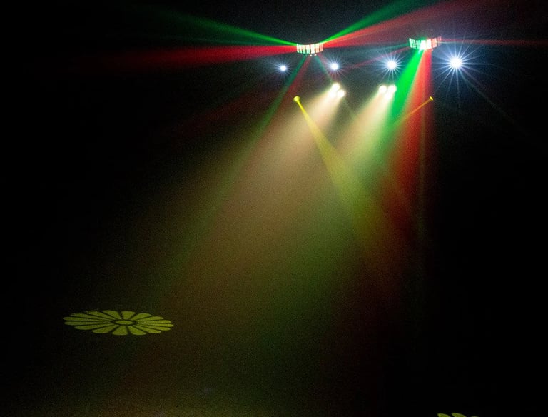 Hire professional event lighting equipment in Christchurch. Uplights, RGB LED pars, moving lights, lasers, and more for weddings, parties, and corporate events.